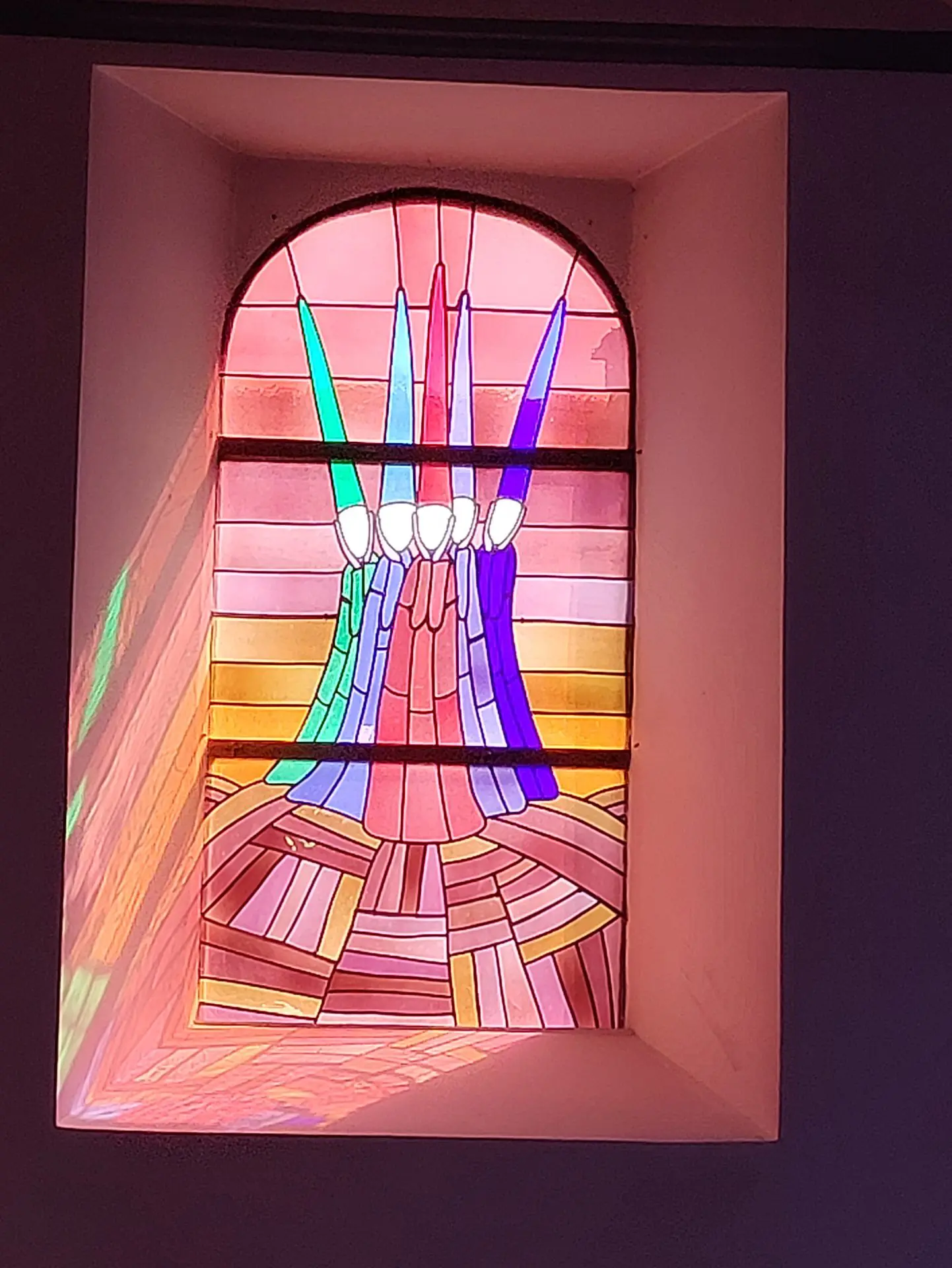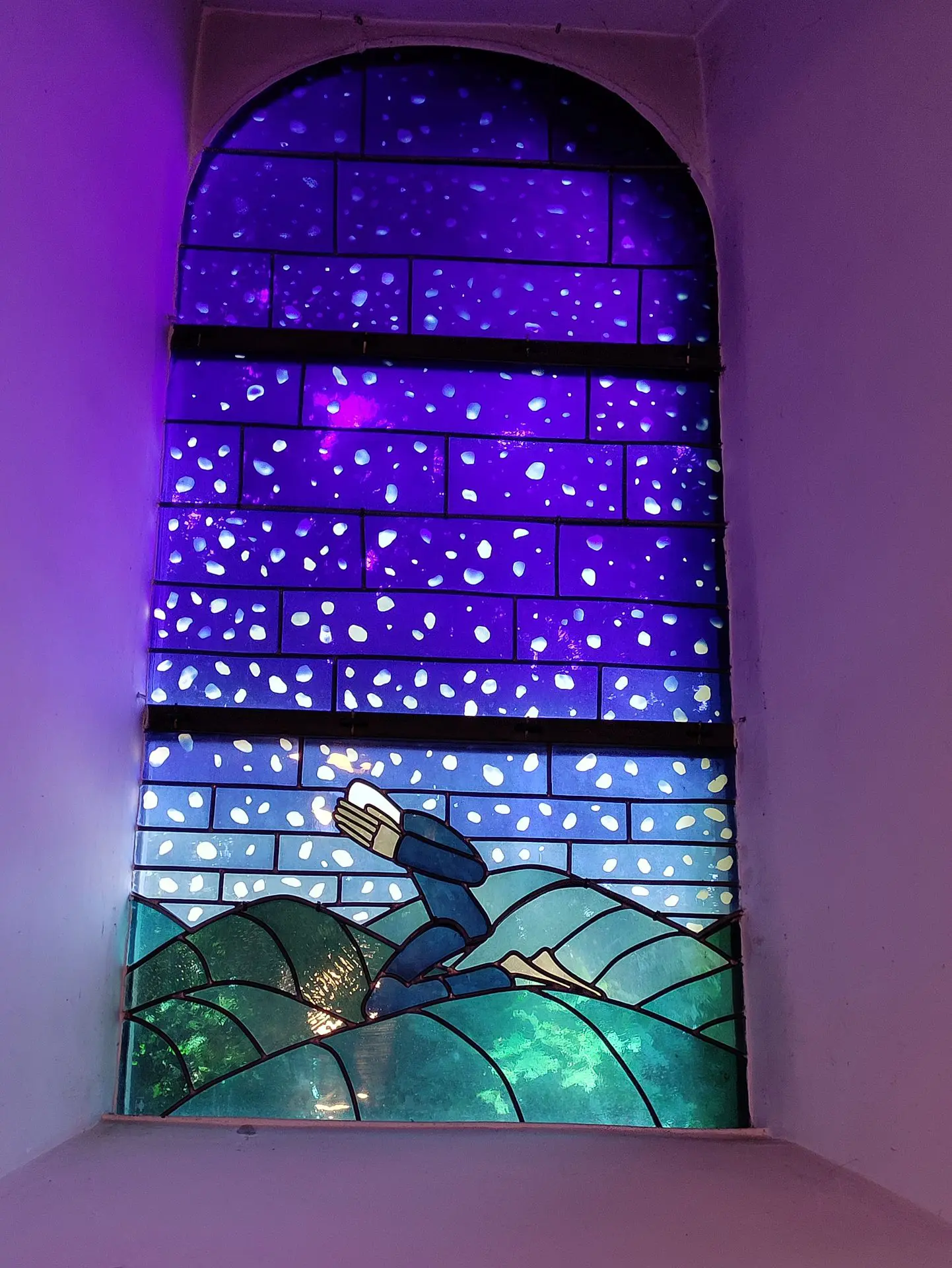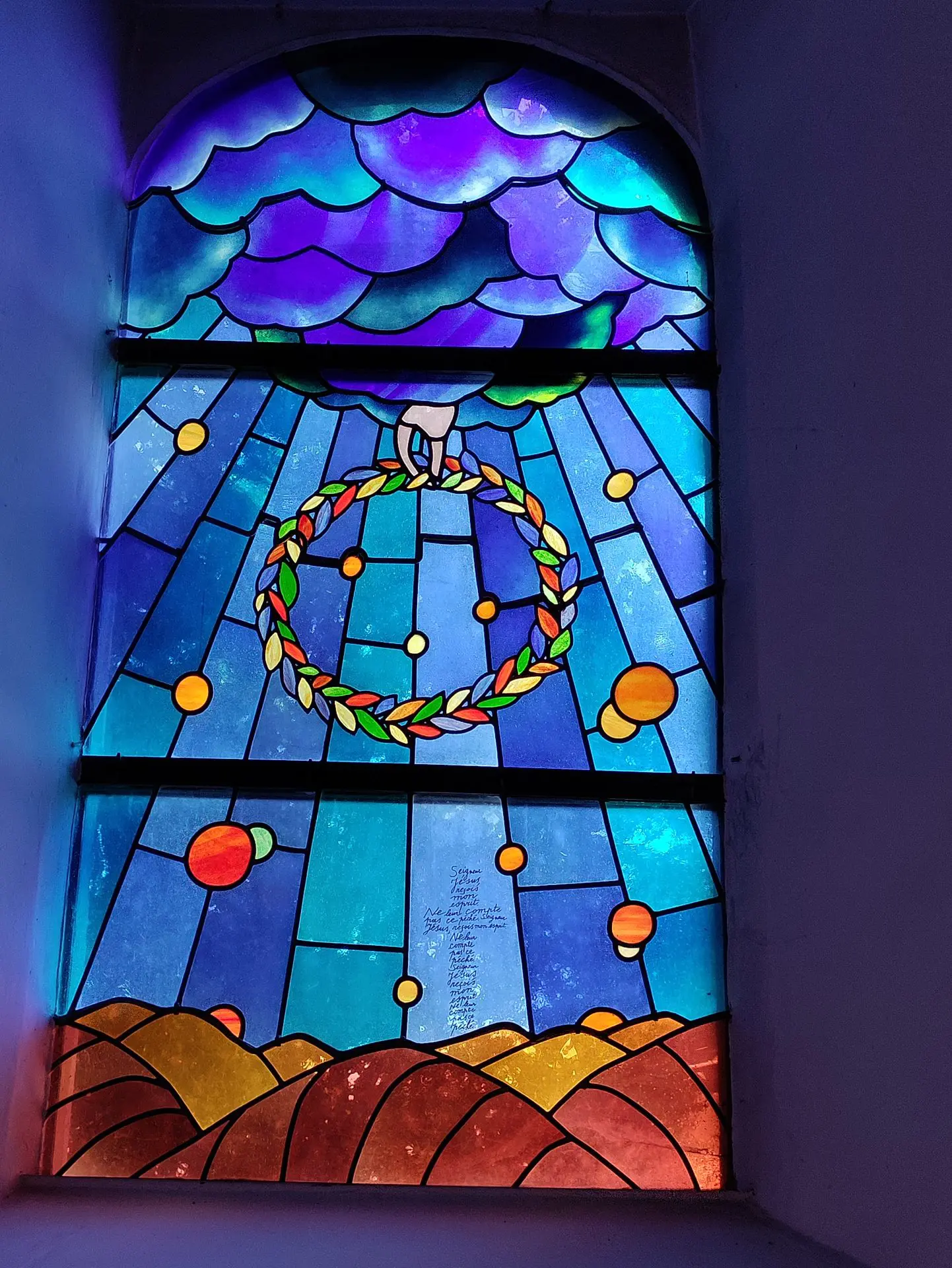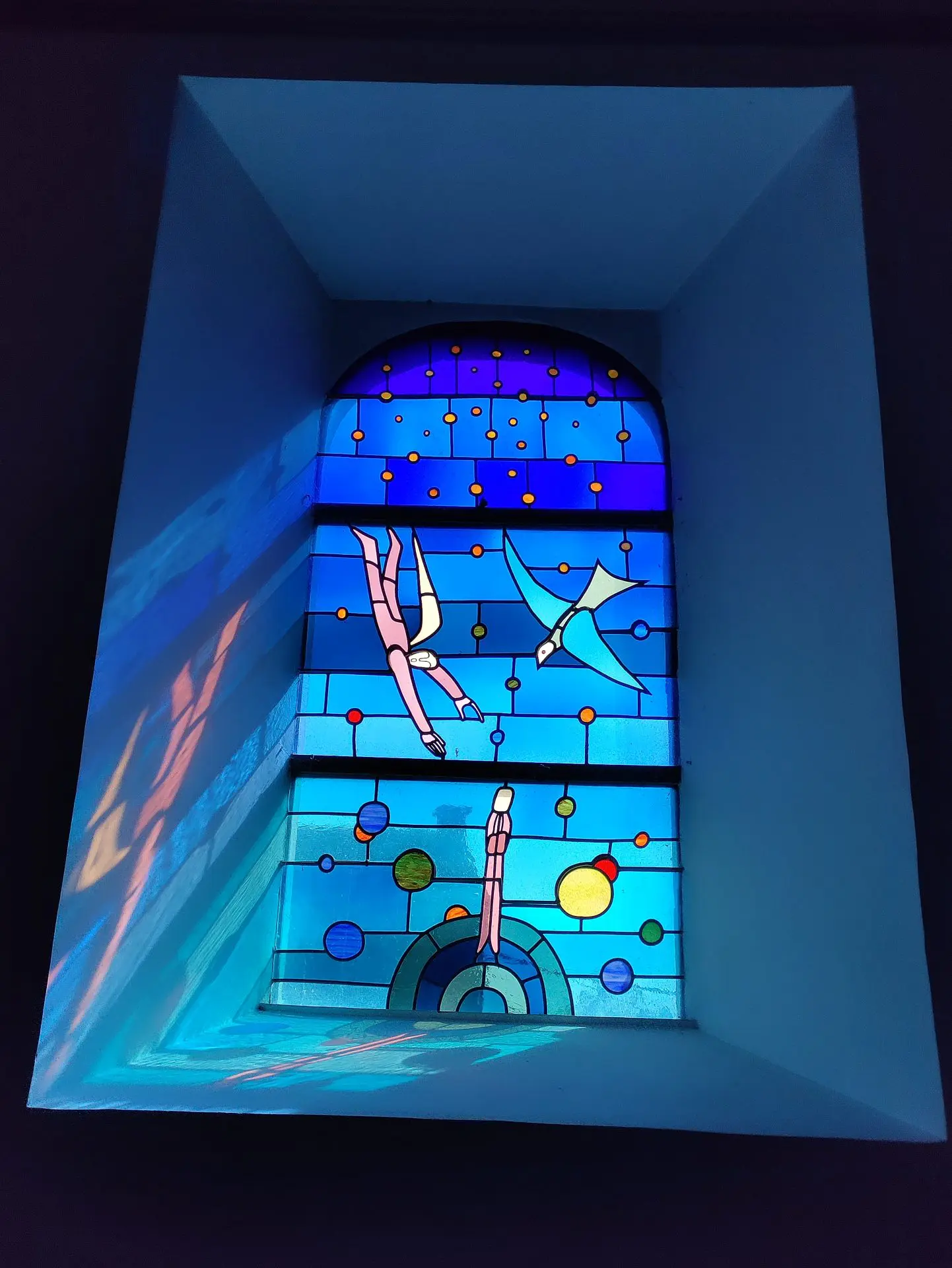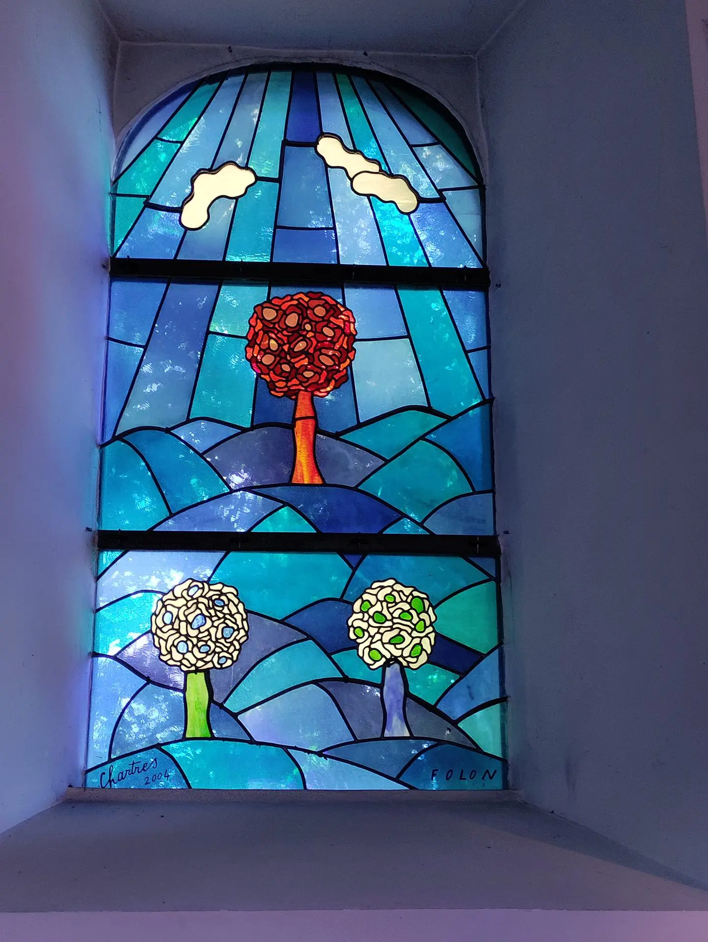 Nous avançons dans l’église à la découverte de ces trésors tout en étant colorés d’une douce lumière qui s’échappe des baies de la nef que Jean-Michel Folon a habillée de ces somptueux vitraux : des oiseaux, sans doute inspirés d’une fresque murale du XIIIe dont un fragment est exposé dans le chœur, s’envolent dans un décor bleu depuis les fenêtres supérieures. Tandis que les vitraux inférieurs ra