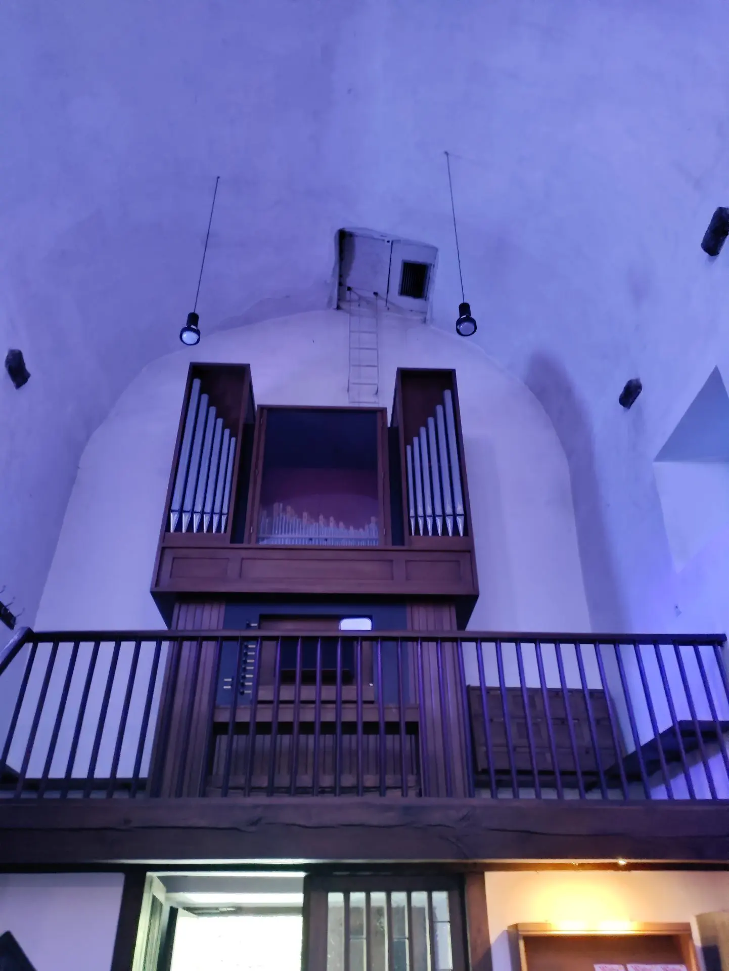 En faisant le tour extérieur de l’église, notre guide attire notre attention sur la présence d’archères qui confirment cette fonction défensive de la tour avant qu’elle ne devienne un clocher. La toiture en forme de bulbe, qui confère aujourd’hui à la tour son aspect si particulier, fut quant à elle ajoutée en 1574. D’autres éléments attestent de ce passé singulier comme le nombre surprenant de portes que l’église possédait. On les repère dans les irrégularités de la maçonnerie. Sept au total. « Parmi celles-ci, une porte seigneuriale, située sur la face nord, permettait autrefois au noble local de pénétrer directement dans l’église et de rejoindre sa tribune privée pour assister aux offices en hauteur, symboliquement séparé du reste de la population. » La « porte des morts », située côté sud, était utilisée lors des enterrements pour transporter les cercueils vers le cimetière qui entourait l’église. En haut de la nef, Monsieur Housiaux nous montre encore deux petites ouvertures triangulaires. Ce sont des anciens accès au pigeonnier qui attestent également l’origine seigneuriale de l’église, car seule la noblesse avait le privilège de communiquer avec d’autres grandes familles par pigeons-messagers.