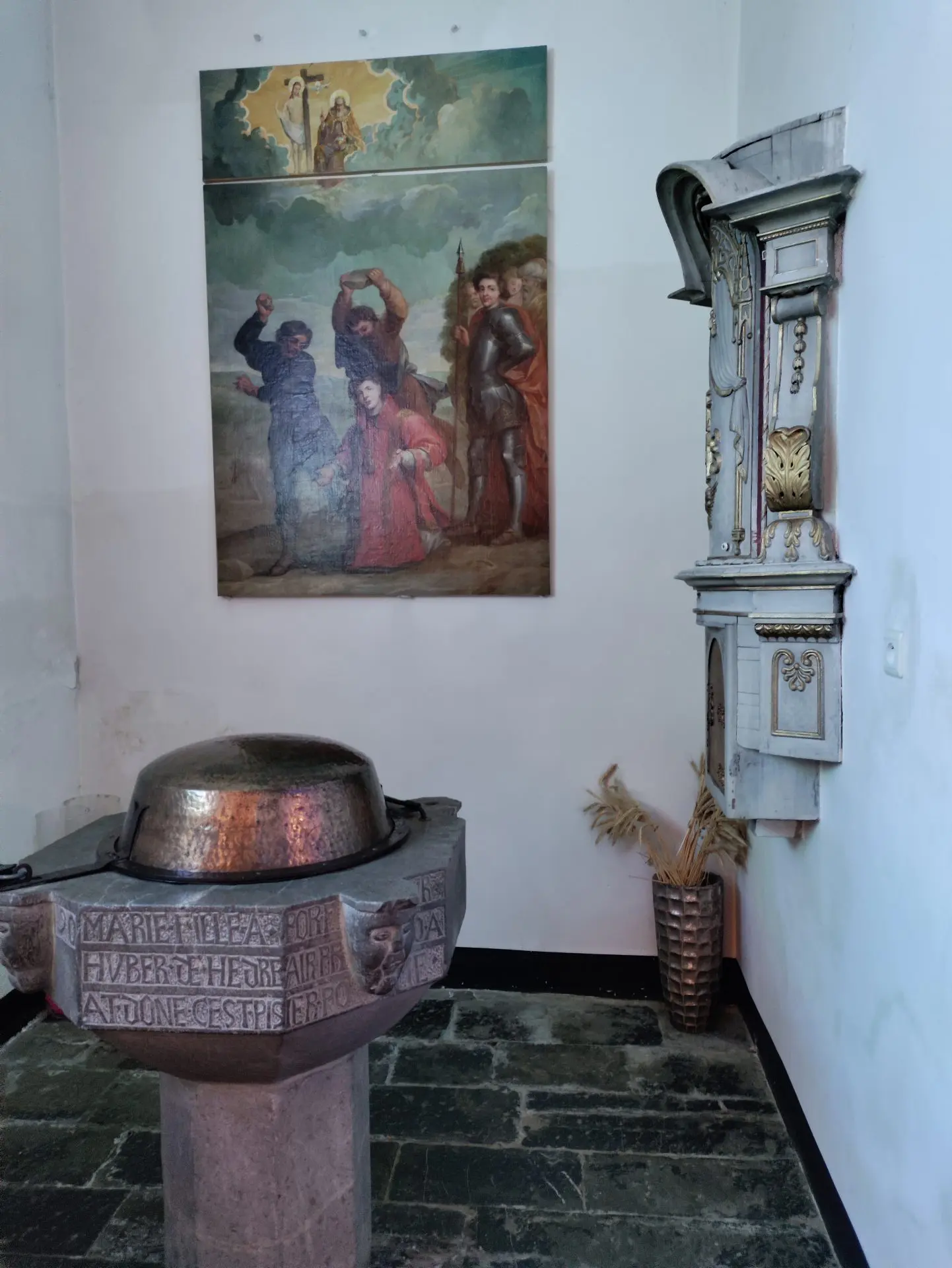 en grès noir, gravée en 1050 pour commémorer la consécration de l’édifice par l’évêque de Liège. Elle témoigne de l’importance du seigneur de Waha à cette époque et fait partie des rares documents historiques de cette période.
