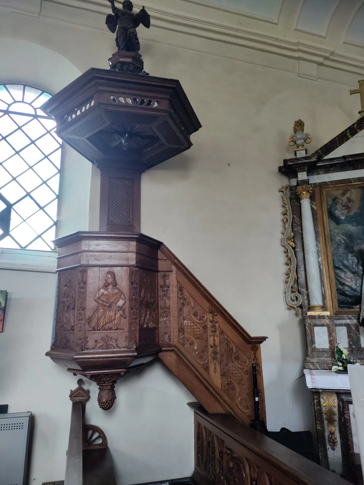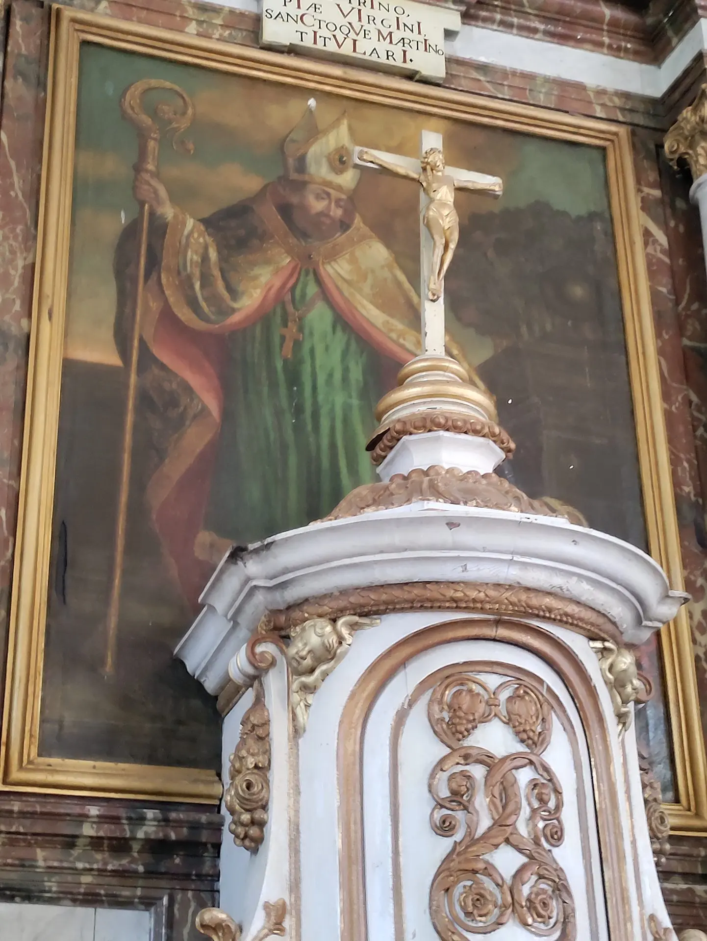 Dans le fond de l’église on peut lire sur le confessionnal l’année de sa réalisation entre les cinq anges joufflus qui le décorent : 1643. La chaire à prêcher est ornée de représentations émouvantes des quatre évangélistes. Des photographies commentées de détails des retables des autels aident à en identifier les représentants. Le maître-autel de style baroque dont un chronogramme indique la date de réalisation – 1673 – est dédié à Saint Martin (décédé en 397). Fêté le 11 novembre, il fut évêque de Tours, aussi nommé « Martin le miséricordieux ». On peut voir sur les autels latéraux, deux autres retables : à droite, La Vierge et l’enfant donnant le scapulaire à saint Simon Stock en guise de protection ; à gauche, une Vierge et l’enfant à l’écoute de saint Charles Borromé la priant d’intercéder auprès des pestiférés. Ce tableau offert par Sire Charles Jamotte, curé à Marcourt de 1636 à 1674 et fondateur de la chapelle saint Thibaut et de son ermitage a la particularité de l’intégrer lui-même dans la représentation : en bas à gauche.