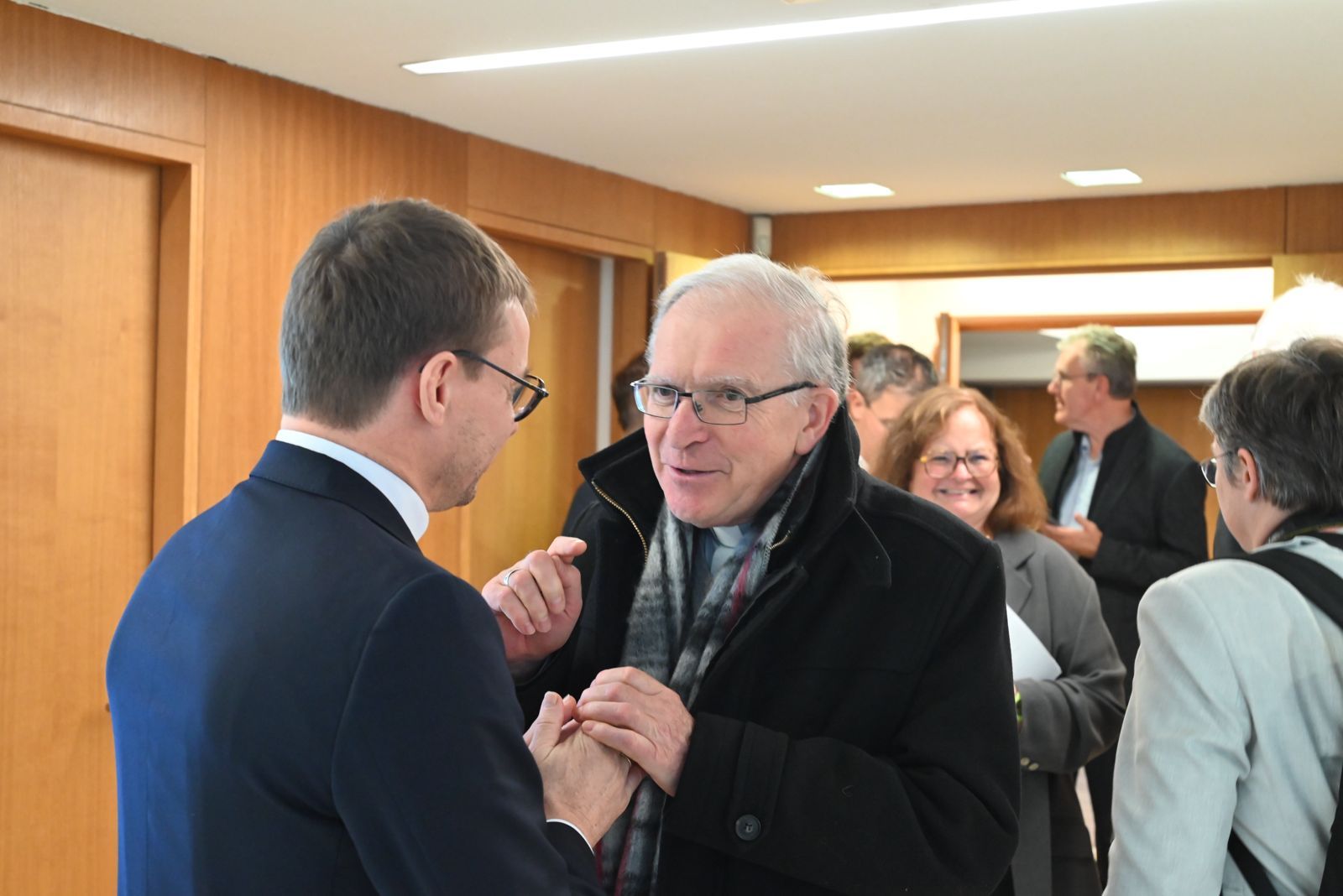 Mgr Lejeusne (diocèse de Namur) et Mgr Rossignol (diocèse de Tournai) sont détendus. Quelques heures plus tôt, ils ont tourné une vidéo de présentation en répondant aux questions de Vincent Delcorps, directeur de Cathobel. Vidéo présentée pour débuter la conférence de presse.