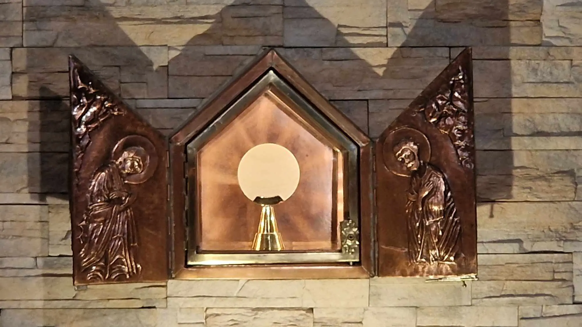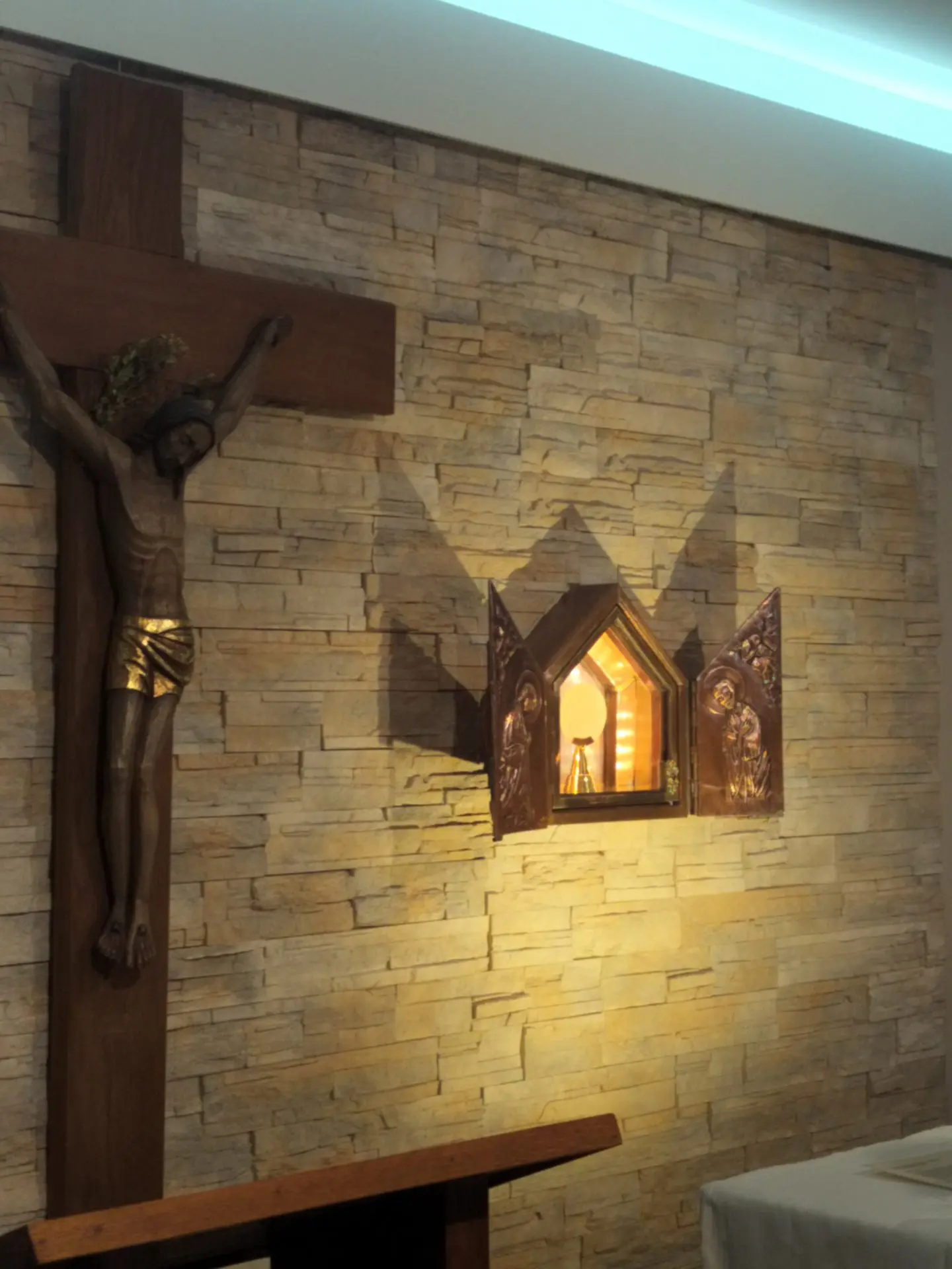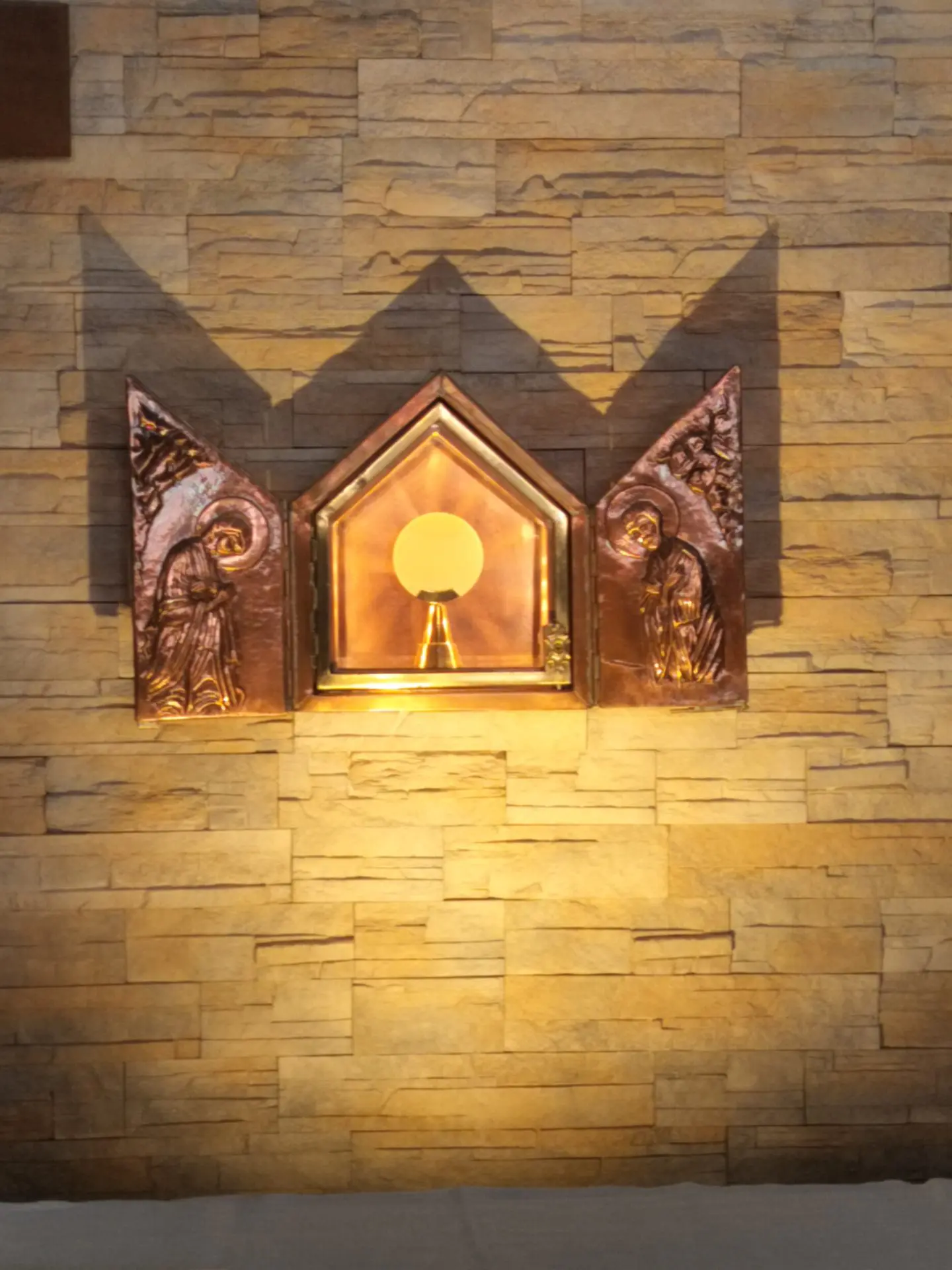 Le doyen, l’abbé Jérumanis est très satisfait du résultat. Colette Lannoy très investie dans la paroisse et plus particulièrement dans l’organisation des temps d’adoration est tout aussi enthousiaste. Un des murs, tout en pierre, est mis en évidence, des coloris clairs ont été choisis pour les peintures. Et puis, il y a le tabernacle. Il est l’œuvre de Guido Clabots, un dinandier… de Dinant. « Le tabernacle a la forme d’une maison. Sur une porte, il y a Marie et sur l’autre Joseph, tous deux en adoration » commente l’abbé Jérumanis.