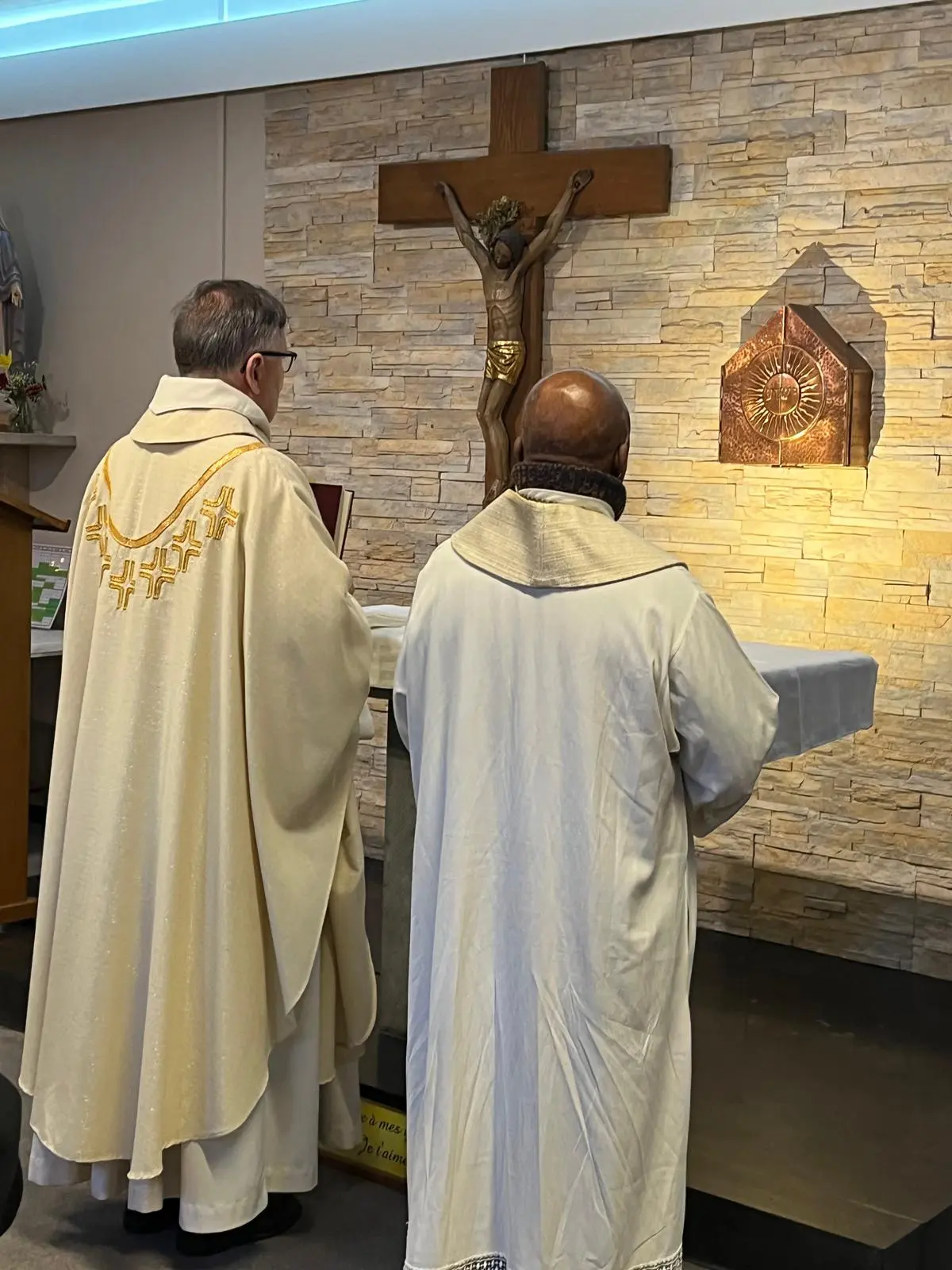 Les personnes chargées d’exposer la Saint-Sacrement, c’est-à-dire d’ouvrir et de refermer les portes du tabernacle ont reçu, lors de l’eucharistie dominicale du 2 février dernier, jour de l’inauguration de la chapelle, une bénédiction pour le service qu’elles rendent au quotidien. Chacun porte une aube lorsqu’il intervient pour l’ouverture comme pour la fermeture du tabernacle. Des moments accompagnés d’une prière, d’un chant, de la lecture d’un texte…