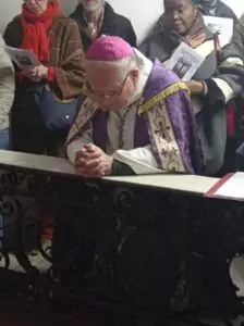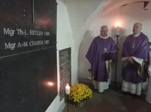 C’est avec les fidèles et les membres de la Maîtrise que Mgr Warin et le chanoine Van Cauwenbergh, archiprêtre et le chanoine Rochette, doyen du Chapitre cathédral se sont dirigés vers la crypte. Mgr Warin a ainsi invité chacun à prier pour les fidèles défunts. Après un temps de recueillement, Mgr Warin a aspergé le tombeau des évêques avant de l’encenser. Il terminera ce moment de recueillement par ces quelques mots : « Donne-leur, Seigneur, le repos éternel. Qu’ils reposent dans la Paix. »