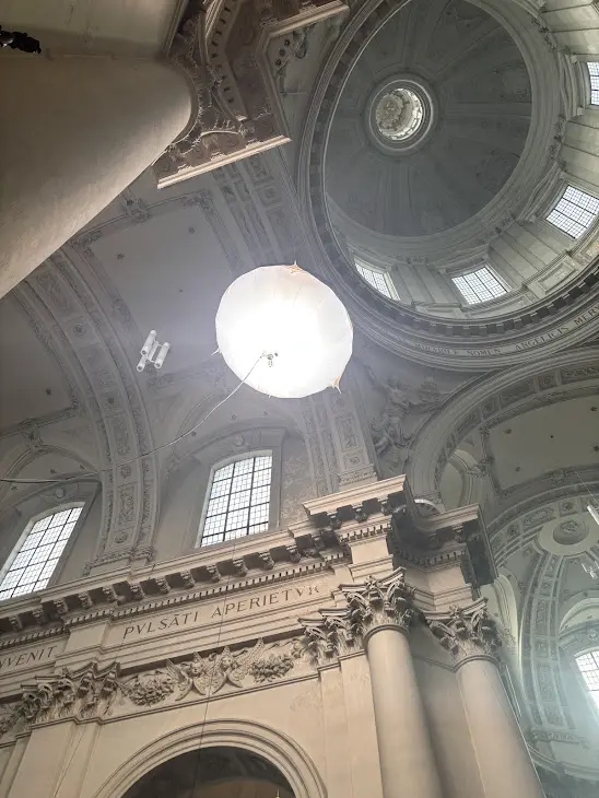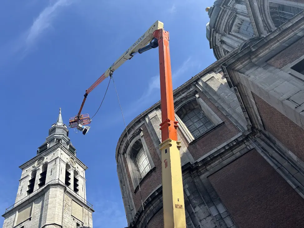 Tout débute par l’éclairage. Une mise en lumière longuement réfléchie et qui a nécessité l’installation d’une boule suspendue dans la coupole (la photo). Une boule chargée de la réverbération de la lumière. Un puissant projecteur était lui installé, à l’extérieur de la cathédrale (la photo), sur une nacelle. La lumière passait ainsi à travers les vitraux. Ceux qui ont eu la chance de pénétrer dans la cathédrale, ce lundi, ont été surpris par la fumée qui flottait dans l’air. Une astuce pour créer une ambiance.