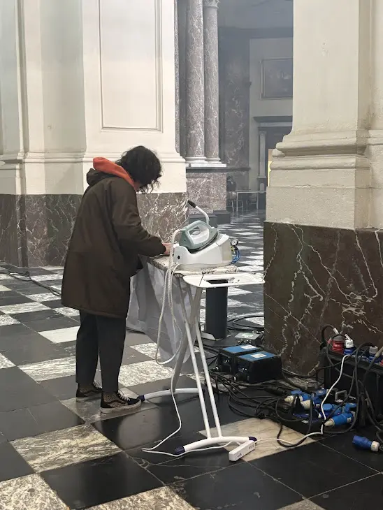 Une planche à repasser était installée dans une des nefs latérales. Et la centrale vapeur a bien fonctionné : chaque tenue devant être impeccable. Le faux pli n’a pas sa place. La maquilleuse veillant, elle, sur les acteurs : un coup de pinceau sur un nez qui brille trop, un coup de peigne pour discipliner une mèche de cheveux rebelle…
