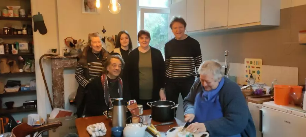 La porte s’ouvre. Sylvain apparaît, accompagné de Gilbert qui est allé le chercher. Dans les mains, un plateau de crêpes encore toutes chaudes pour le dessert. Peu après arrivent Hubert et Daniel avec William. Ils sont voisins dans le domaine d’Hermeton. Dans la grande salle du presbytère, Marie-Claude, Wendy, Véronique, Marianne, Marylène, Jean-François, Yves et l’abbé Bruno sont déjà là. La soupe mijote encore dans la cuisine. La table est dressée, les bols sont prêts, les conversations vont bon train.