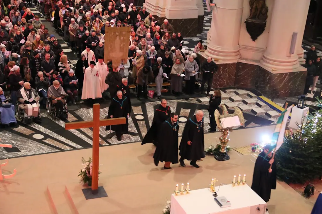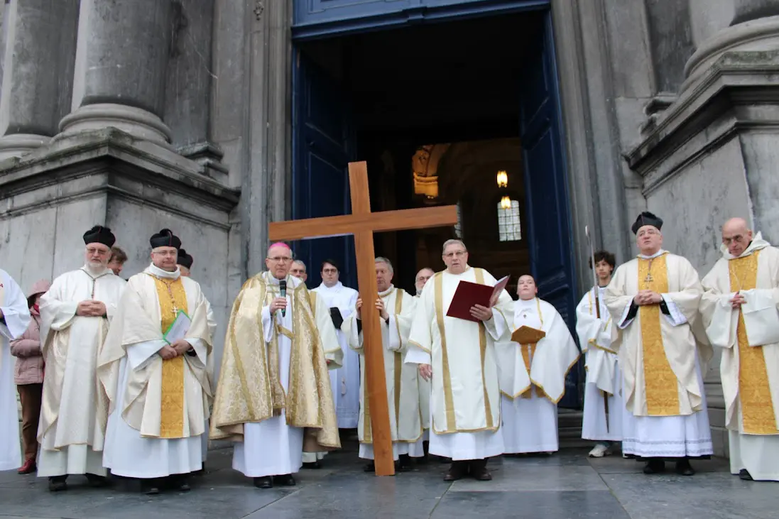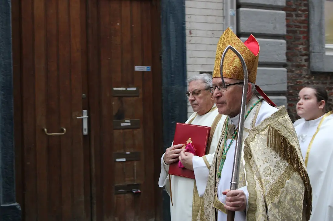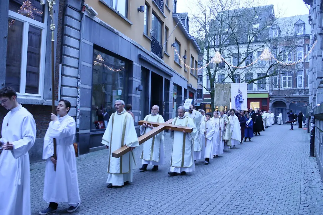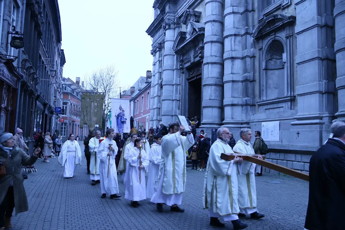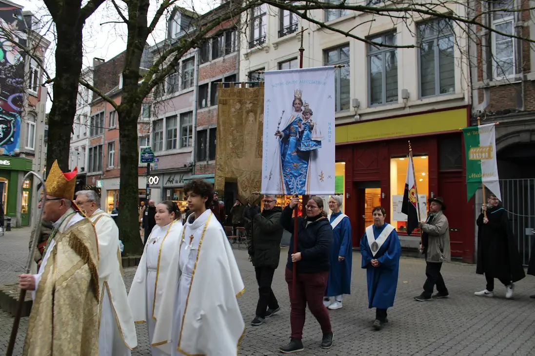 La croix qui restera présente durant l’Année Sainte dans la cathédrale ouvrait la procession. Dans la procession encore, outre les fidèles, des représentants de l’Ordre équestre du Saint-Sépulcre de Jérusalem, la Confrérie des Pairs de Saint Berthuin et de Saint Mutien de Malonne avec le porte-bannière, les Gardiens de la Vierge de Walcourt et le porte-bannière, des Scouts d’Europe avec drapeau. Des bannières de l’UP (Unité Pastorale) de Durbuy, de Notre-Dame de Beauraing et la bannière de la Vierge (église Saint-Nicolas, Namur).