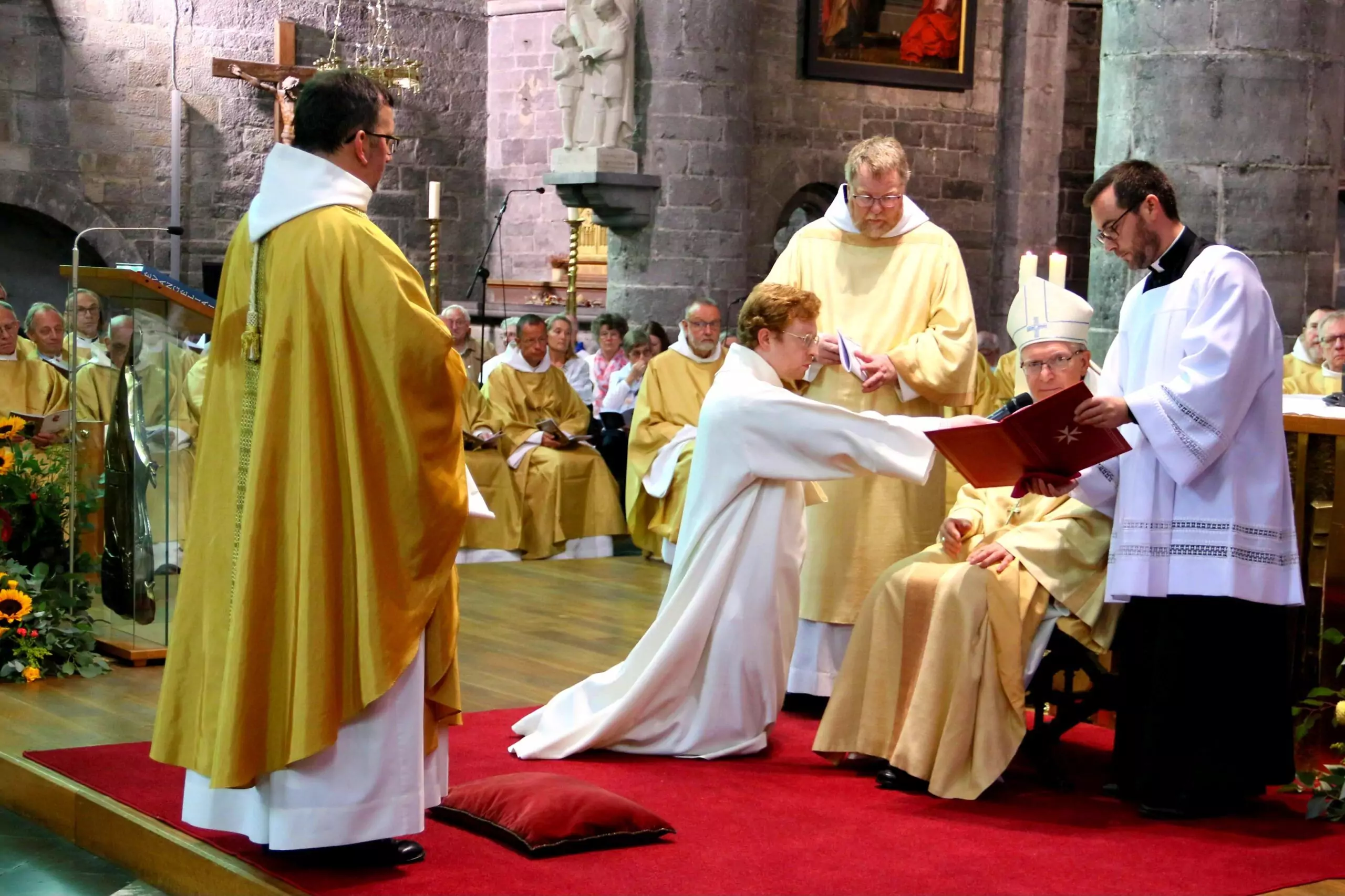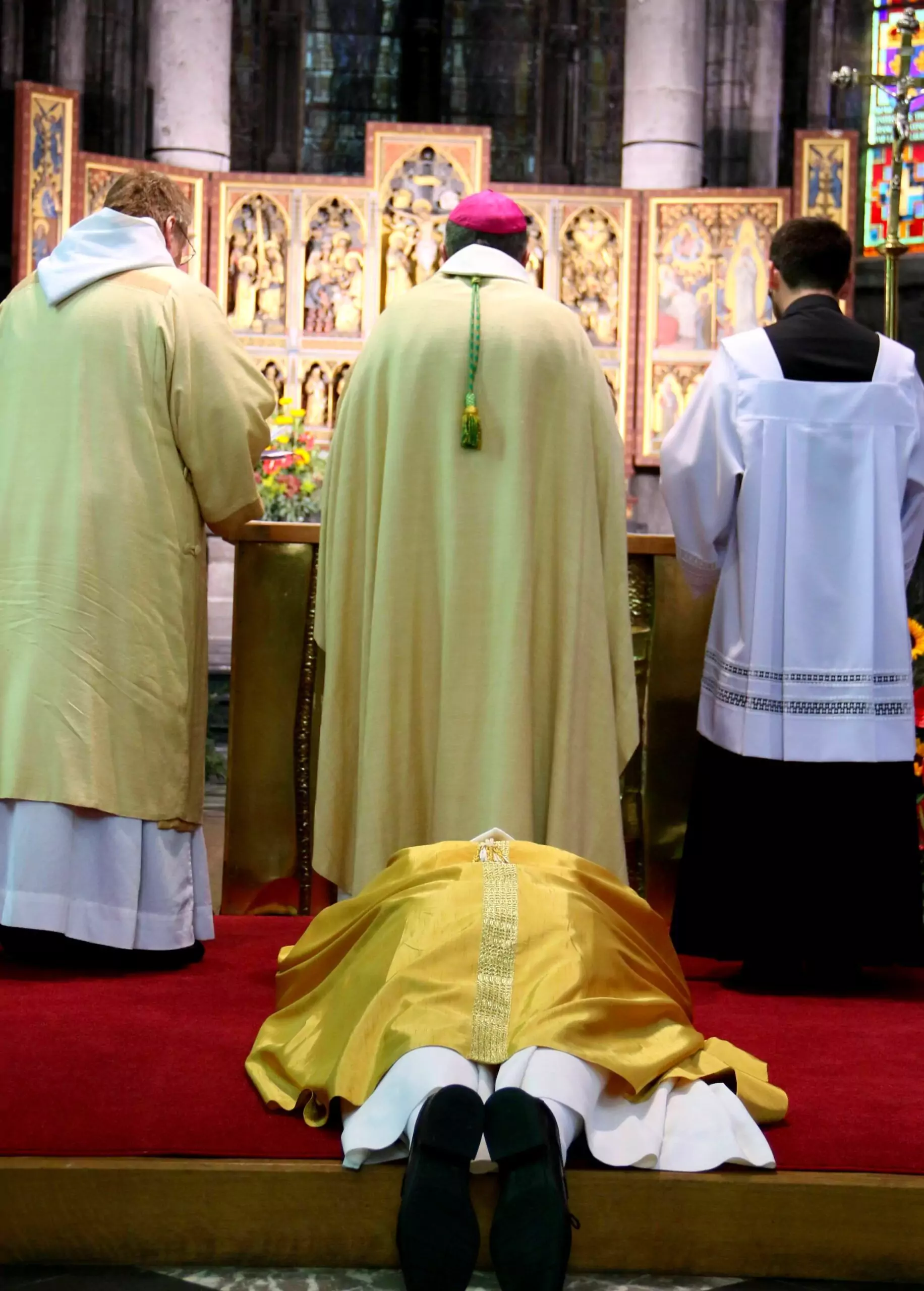 Le père abbé Christophe Monsieur s’est ensuite allongé sur le sol, face contre terre, durant la supplication litanique, signe de la petitesse de l’homme devant Dieu. Un long moment toujours émouvant suivi de la prière de bénédiction prononcée par Mgr Warin. « Accorde-lui la grâce de vivre en conformité avec le titre qu’on lui donne, y est-il notamment mentionné, de sorte que son enseignement, comme un ferment de vie divine, pénètre avec plus d’efficacité au cœur de ses disciples. »