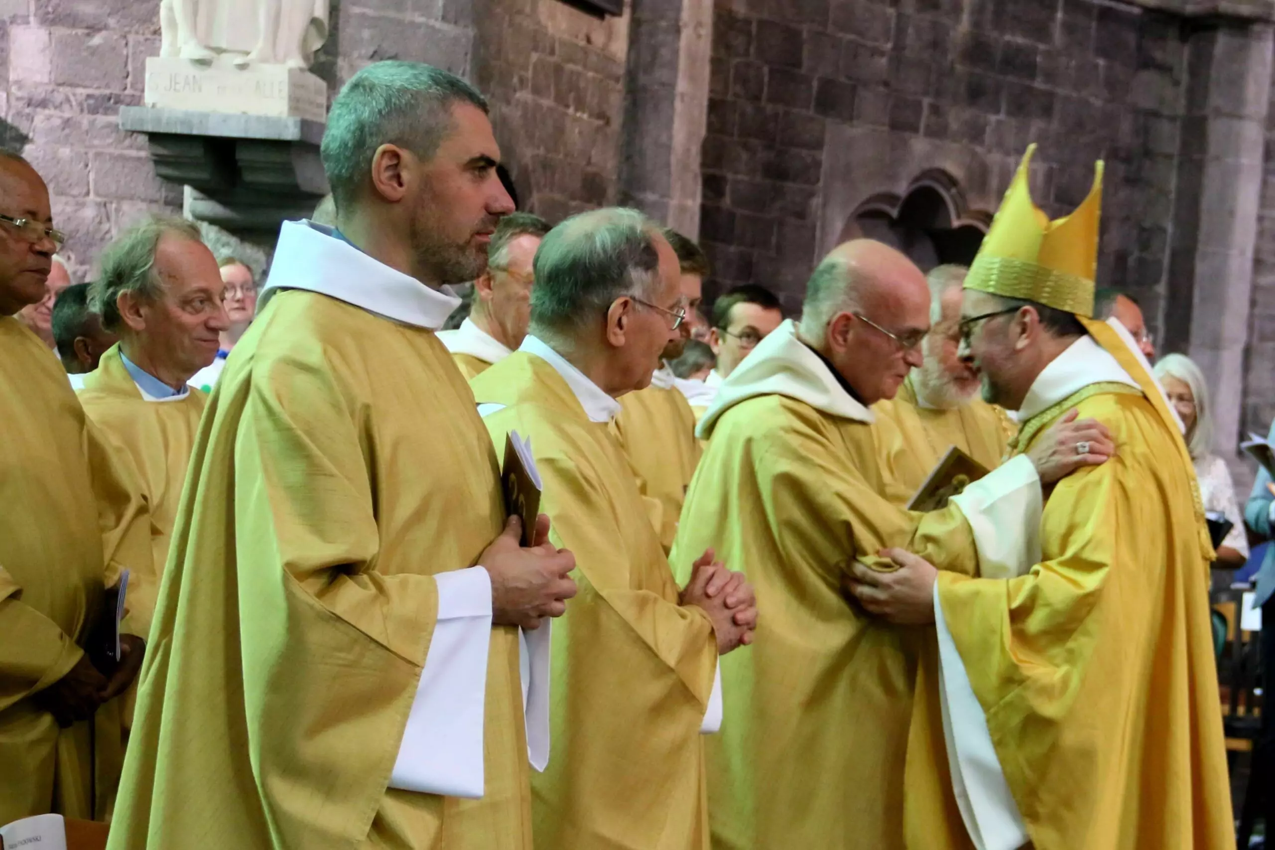 Restait au père abbé à recevoir les insignes abbatiaux : la règle de Saint-Auguste puis l’anneau que l’évêque lui glissera à l’annulaire droit, la mitre et la crosse, le bâton du pasteur. Des applaudissements nourris ont directement fusé alors que le nouvel abbé recevait le baiser de paix de l’évêque puis des abbés présents. Baiser de paix partagé aussi avec les frères de son monastère. Main dans la main dans le diocèse