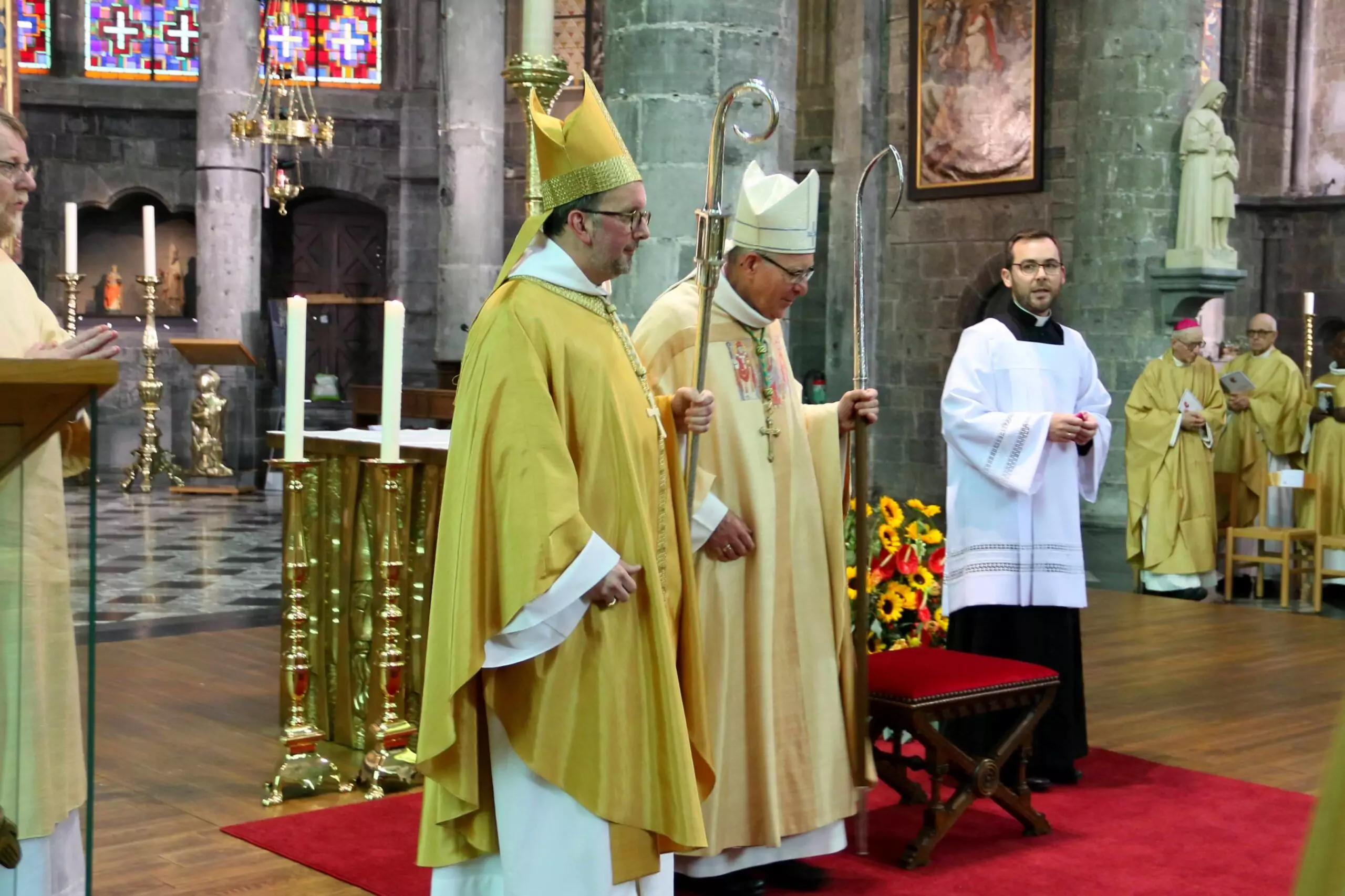 A quelques minutes du début de la bénédiction abbatiale, le père abbé Christophe Monsieur n’a toujours pas revêtu les habits liturgiques. Il veille à l’installation des invités du jour dont, naturellement, de nombreux prémontrés de Belgique dont Averbode où il est entré à l’abbaye en août1995, de France, des Pays-Bas, de Tchéquie, de Hongrie, d’Espagne, du Royaume-Uni… mais aussi de la République Démocratique du Congo. Lorsqu’il remonte l’allée centrale de la collégiale de Dinant, le père abbé même s’il exerce déjà les responsabilités liées à ses fonctions depuis l’élection ne porte ni la mitre, ni l’anneau. Pas plus que la crosse. Ces insignes abbatiaux, il les recevra, au cours de la célébration présidée par Mgr Pierre Warin, évêque de Namur.