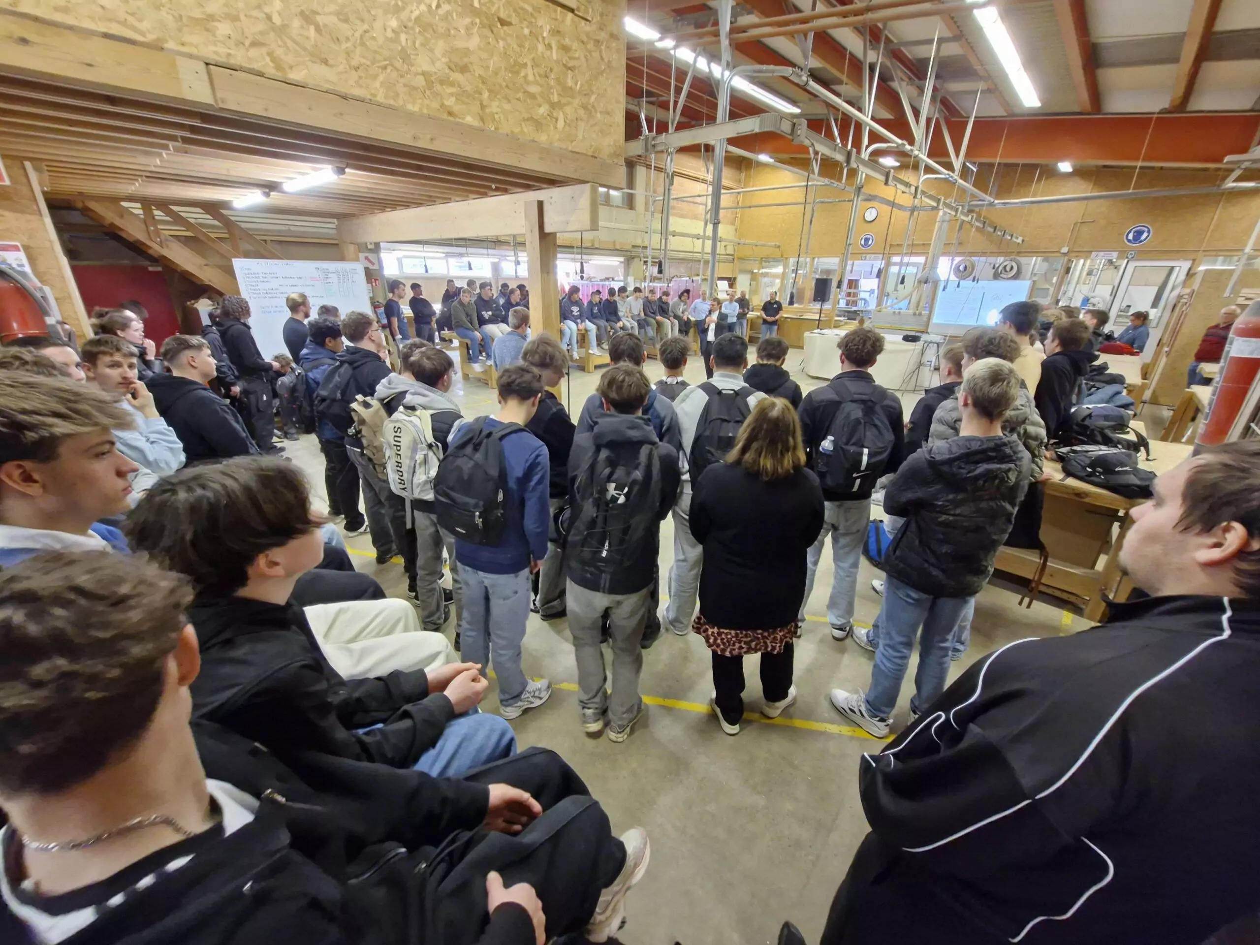 Une centaine de jeunes, de la 3e à la 7e année, rassemblés dans le vaste atelier de menuiserie du Centre Asty Moulin et leurs professeurs ont fait connaissance avec … deux menuisiers ! Saint Joseph bien sûr mais aussi Mgr Fabien Lejeusne. L’évêque de Namur a rappelé qu’il avait d’abord étudié la menuiserie et travaillé dans le secteur avant de se tourner vers la prêtrise.