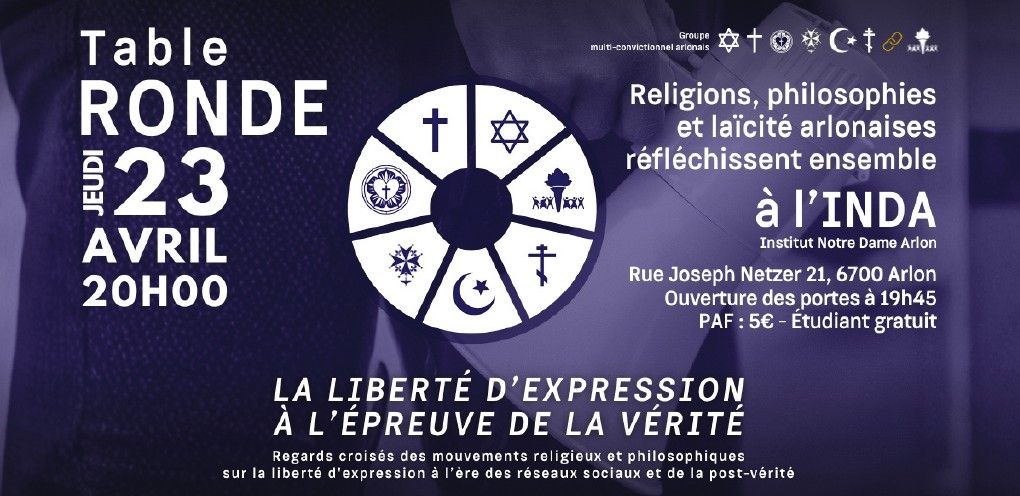 Le groupe multi-convictionnel arlonais convie le public à une soirée de réflexion et d’échange autour d’un thème aussi actuel que fondamental : « La liberté d’expression à l’épreuve de la vérité ». Cette table ronde se tiendra le jeudi 23 avril 2026 à 20h, à l’Institut Notre-Dame d’Arlon (ouverture des portes à 19h45).