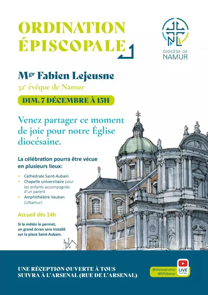 La messe d’ordination épiscopale de Mgr Fabien Lejeusne, 32e évêque de Namur, sera célébrée le dimanche 7 décembre 2025 à 15h à la cathédrale Saint-Aubain de Namur.