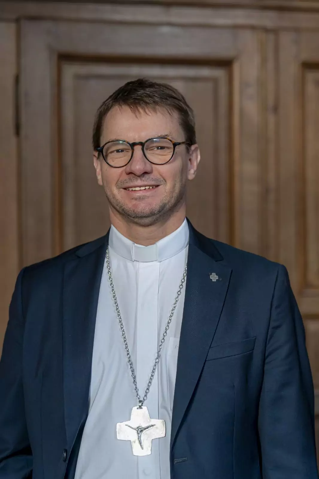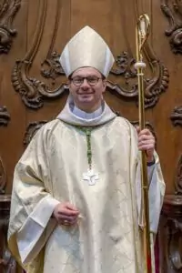 - La photo de l’évêque en tenue liturgique : c’est celle qui a naturellement sa place dans les sacristies ou les lieux liés à la célébration.