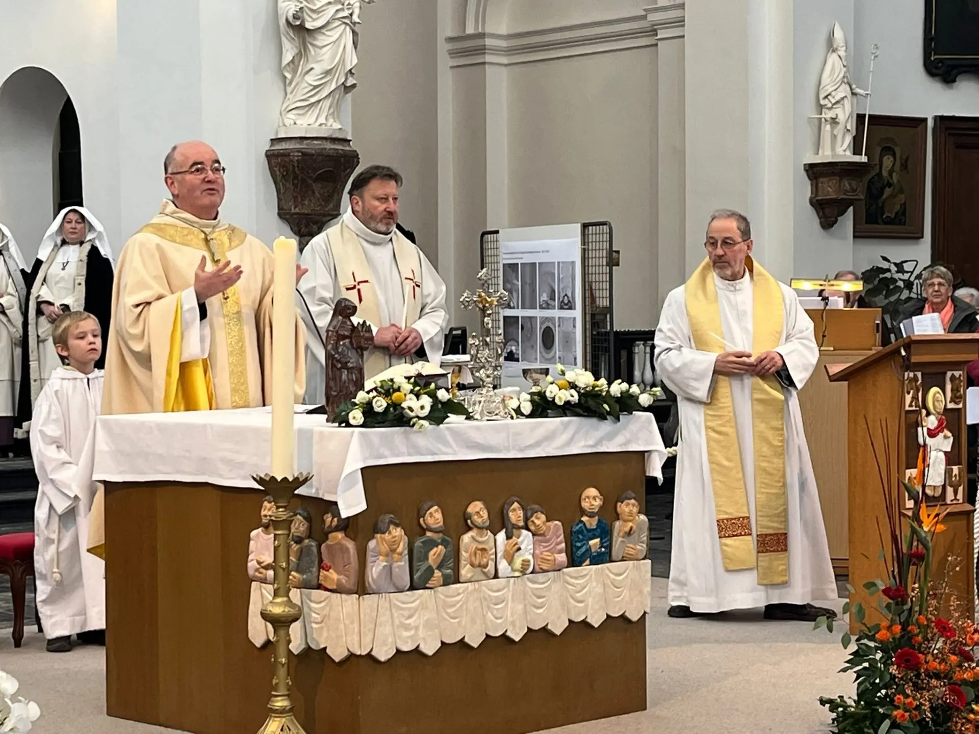 Le dimanche, second temps de cette réouverture, avec la célébration d’une messe solennelle présidée par le chanoine Rochette, vicaire général. Dans son homélie axée principalement sur l’évangile du jour « La présentation de Jésus » : « Je vous invite à venir habiter cette nef, la si belle embarcation que constitue votre collégiale rénovée. Je vous invite à y venir, et à y revenir, pour y scruter les Ecritures Saintes et y être des priants… comme la Vierge Marie, comme Syméon et Anne, comme Begge. Y venir peut-être aussi pour livrer le combat contre soi-même et contre les forces obscures de la mer qui envahit ce monde. Pour y pêcher le Christ, l’y découvrir, présent comme celui qui fait venir à la lumière. »