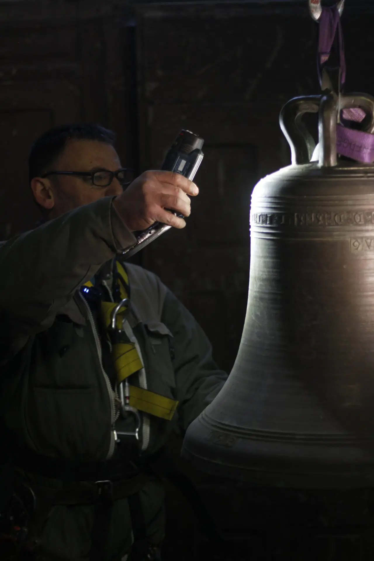 Si le chanoine Van Cauwenbergh a été ému en entendant sonner la première cloche, il en était de même pour Olivier Baudri. Lui aussi est un véritable passionné : « Cela fait 35 ans que je ne travaille pas ! » dit-il. Un métier de touche à tout, il faut être à la fois électricien, menuisier, s’y connaître en électronique… Sportif également. Chaque jour, les artisans campanaires grimpent et descendent des centaines de marches. « Le plus dur a été, ici, d’obtenir une autorisation de stationnement pour la camionnette. » ajoute, avec humour, Olivier Baudri. Et d’ajouter : « on découvre des endroits que personne ne voit. » Ce n’est pas le cas ici à Saint-Loup mais, à bien des reprises, il a découvert des inscriptions gravées sur les murs des clochers. Les auteurs ? Des personnes qui, durant les guerres, ont été cachées dans ces endroits pour échapper à l’envahisseur.