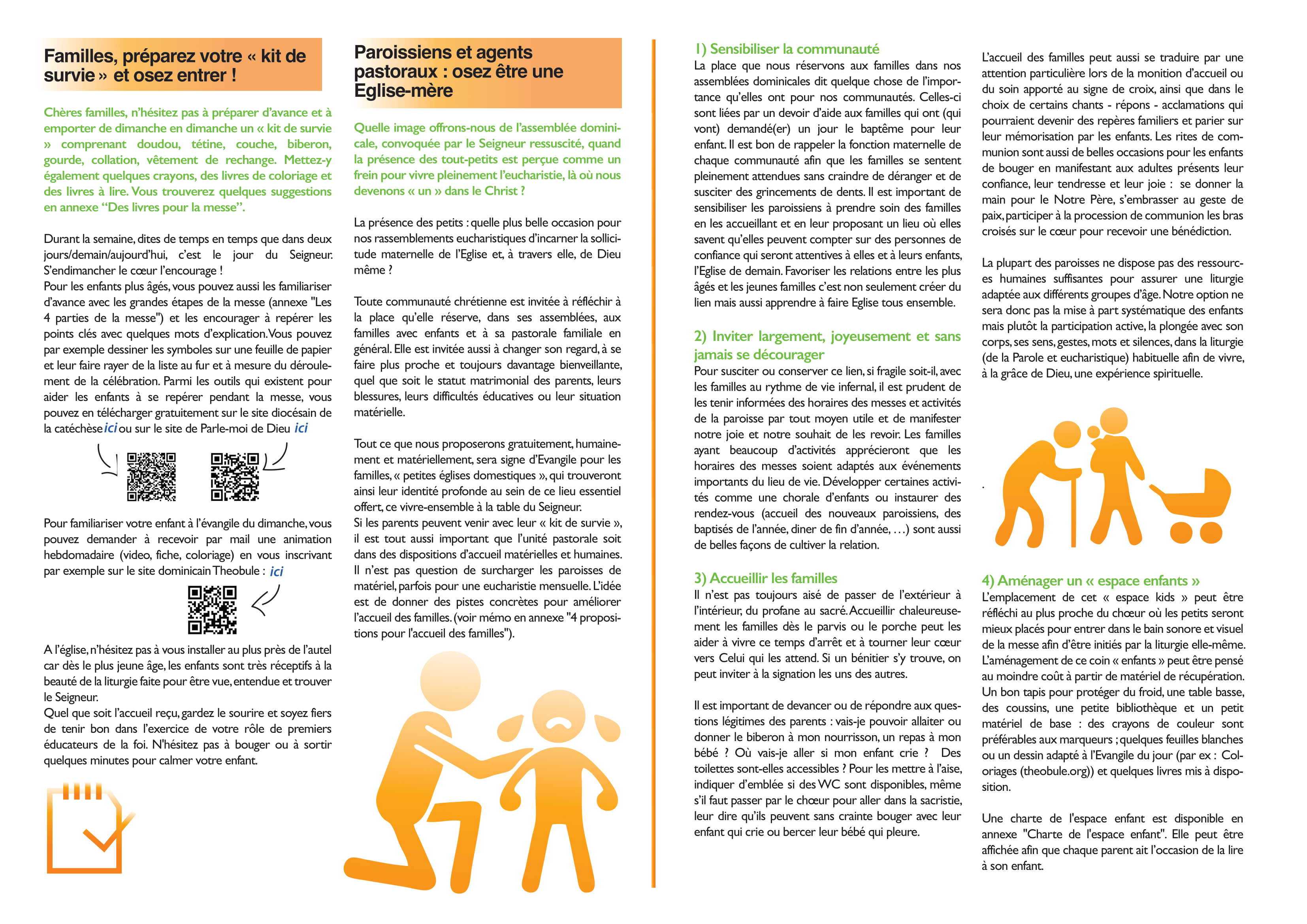 Ce kit comprend des propositions concrètes pour aider les petits enfants de participer à leur manière à l’eucharistie dominicale toute en permettant à leurs parents de la vivre pleinement. Les paroissiens et agents pastoraux sont invités à réfléchir à la question du « pourquoi » et du « comment » accueillir au mieux les tout-petits et leurs parents dans les célébrations. Ce kit est accompagné de 4 annexes destinées à être affichées dans les églises paroissiales :