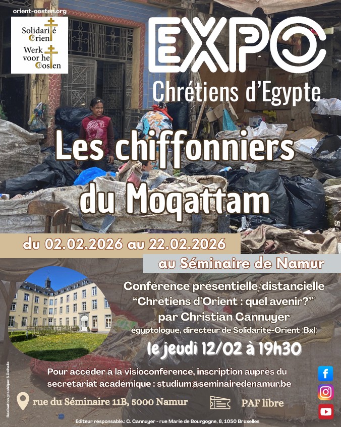 Une exposition sur les Chrétiens d’Egypte « Les chiffonniers du Moqattam » se tiendra du 2.02.2026 au 22.02.2026 au Grand Séminaire de Namur. L’entrée est libre.
