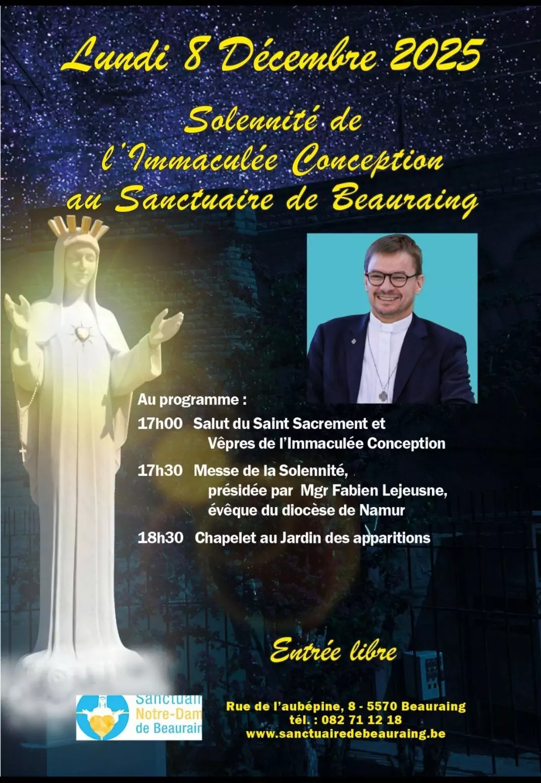 Soyez les bienvenus ce lundi 8 décembre pour vivre la solennité de l’Immaculée Conception au Sanctuaire de Beauraing. Rendez-vous dès 17h pour le Salut du Saint Sacrement et les Vêpres de l’Immaculée Conception. A 17h30, la messe sera présidée par notre évêque, Mgr Fabien Lejeusne et sera suivie d’un chapelet au jardin des apparitions.